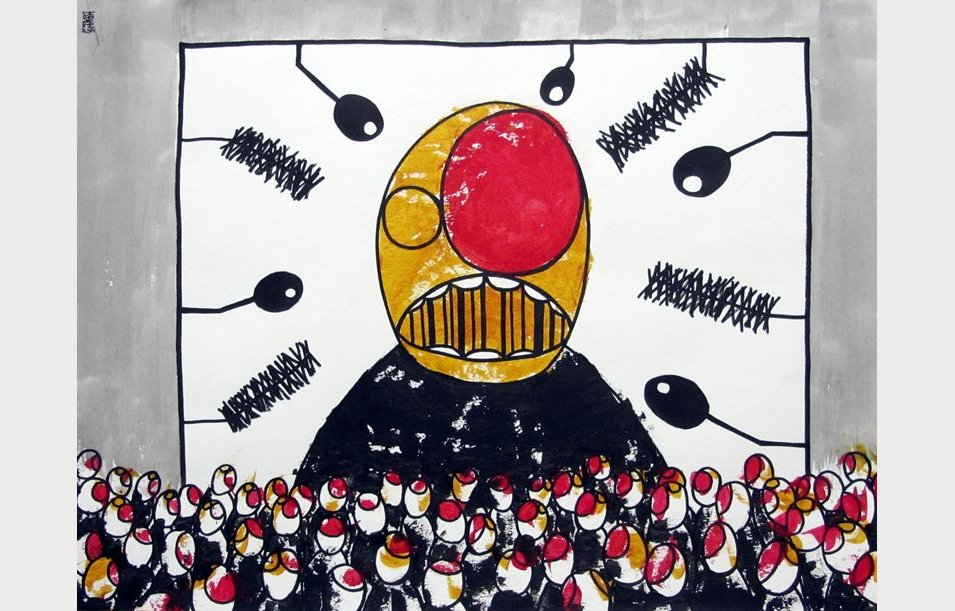 ![]() Image sélectionnée : 2014 : : La Foule et son Sauveur Providentiel : : peinture acrylique, encres & Posca, 65x50cm