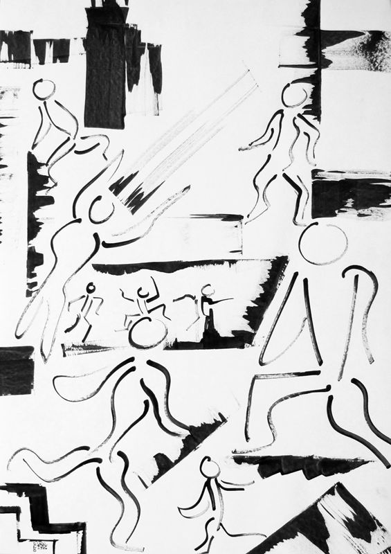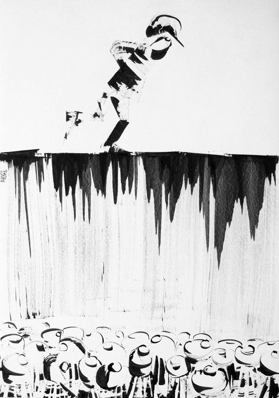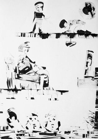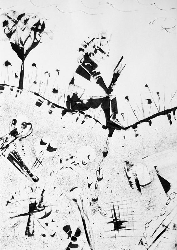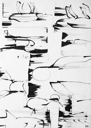 Dessins et peintures en noir et blanc, généralement à l'encre noire (aplats, lavis, traits...) et à la peinture acrylique, ou avec autres (…)