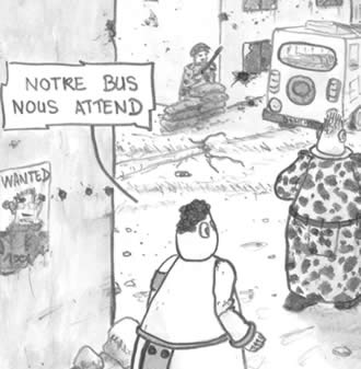 Cette bande dessinée pleine d’humour noir dénonce toutes les guerres : ethniques, fratricides… Nous suivons un groupe hétéroclite de touristes français dans un pays en proie à une guerre confuse, leur parcours sera jonché de satire grinçante et de morts violentes.